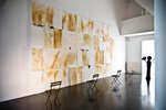 La riflessione sulla storia della pittura e sulle tecniche diventa l’elemento portante di molte opere, come quella con i palloncini qui esposta, proveniente dalla serie creata nel 1965 per la Galleria Stein di Torino. L’elemento ludico e partecipativo è del resto presente in tutta la sua opera successiva, accompagnato all’uso di materiali extra-pittorici, effimeri e talvolta edibili che, come ha lui stesso dichiarato: “sono il frutto di quella dimensione miope, di quella distanza che mi fa vedere da lontano un oggetto che da vicino diventa un altro…”. Lo testimoniano le installazioni realizzate con la pasta di caramella, col cioccolato o con lo zucchero, come nello spettacolare Muro del Pianto (4x6,40 m) fatto di zucchero e costruito nel cortile di Mudima, nell’ambiente interamente ricoperto di marshmallows realizzato nella piscina al piano interrato o nell’installazione a pavimento Raccolto in preghiera, un enorme tappeto di preghiera fatto da decine di granaglie diverse. In dialogo con quest’ultimo, su una grande parete, sono esposti i celebri Tappeti realizzati su eraclite, un materiale usato nell’edilizia, in colori brillanti: sovrapposti e accostati conferiscono alle sale dello spazio milanese la girandola di colori di un fantasmagorico suk medio-orientale.