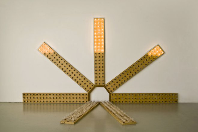 Sono presenti in mostra un nucleo di opere concentrate fra il 1964 e il 1968, che testimoniano il flusso di produzione di Mondino dai “Quadri a quadretti” ai “Quadri con i palloncini”, significativa la presenza di un’opera come “Sole” del 1967, fra i pochi lavori realizzati dall’Artista mediante l’uso della corrente elettrica.