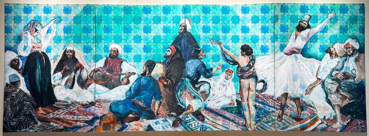 ‘Festa araba’ di Aldo Mondino (1935/2005) e ‘Il grande sacrificio’ di Lorenzo Puglisi (1971) sono le due opere monumentali che compongono la spettacolare mostra dal titolo ‘Aldo Mondino – Lorenzo Puglisi. La Resistenza’, allestita dal 3 al 16 febbraio 2025 nella Sala Berti dell’Istituto Storico Parri di Bologna (via Sant’Isaia, 20) per l’Ottantesimo Anniversario della Liberazione (1945). La mostra, a cura di Barbara Vincenzi, è promossa dall’Archivio Aldo Mondino di Milano e dalla Galleria Santo Ficara di Firenze, in collaborazione con l’Istituto Parri con il patrocinio di Comune di Bologna, Assemblea Legislativa della Regione Emilia-Romagna, Città Metropolitana di Bologna e si svolge nell’ambito di ART CITY Bologna 2025, in occasione di Arte Fiera. Una mostra basata sulla forza della libertà e delle proprie convinzioni. Un grande omaggio, per dimensioni e intenzioni, alla Resistenza italiana che concluse la Seconda Guerra Mondiale liberando il nostro Paese dall’occupazione nazi-fascista. Un simbolo visivo e tattile della possibilità di percorrere strade impervie che onorano i principi propri degli artisti e uomini Mondino e Puglisi. Due opere pittoriche fuori misura, di oltre sei metri ciascuna, di forza e importanza pari all’evento di ricorrenza storica fondante la nascita della Repubblica Italiana, grazie alla simbologia che i due lavori rappresentano. Nei due lavori, infatti, è racchiuso il senso umano e mistico di una Resistenza intesa come tributo all’estremo sacrificio offerto da giovani uomini e giovani donne per garantire lo Stato di diritto e le libertà civili di cui godiamo oggi e che troppo spesso diamo per scontate, ma che rappresentano anche la Resistenza dell’oppresso verso l’oppressore in ogni guerra e in ogni tempo, la Resistenza del diverso verso l’establishment e quella dell’artista nei confronti di un mondo che non ricerca più la fatica della pittura e di quell’isolamento che, se di pittura radicale si tratta, inevitabilmente ne deriva.